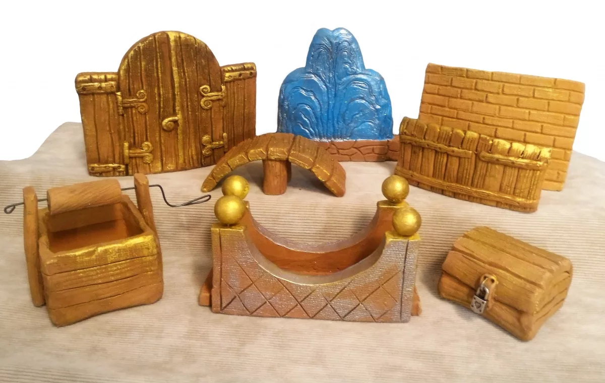 В наборе 8 стилизованных глиняных фигурок: фонтан, сундук, забор, колодец, ворота, 2 моста, кирпичная стена.