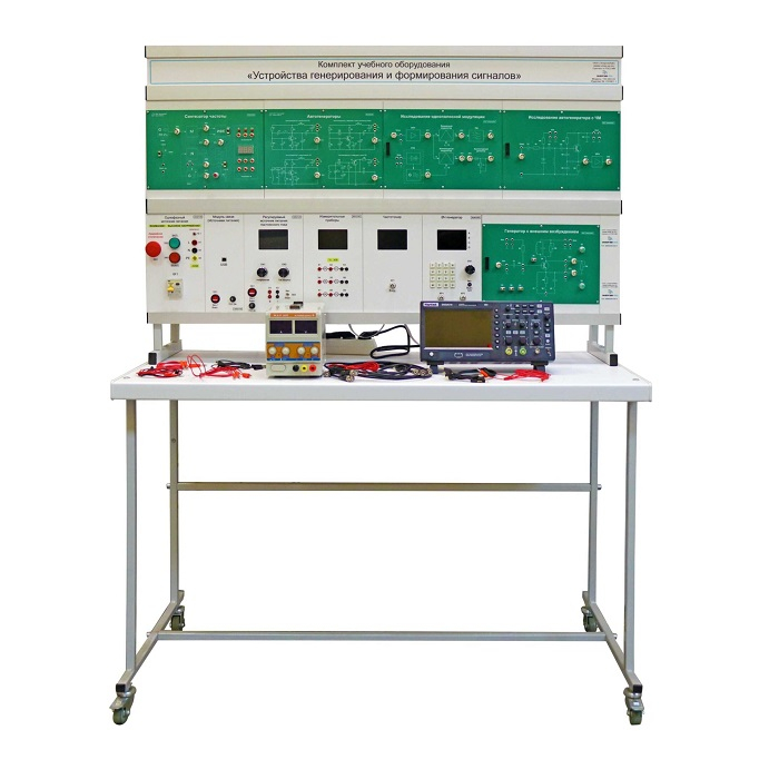 Комплект учебного оборудования «Устройства генерирования и формирования сигналов» выполнен в стендовом исполнении: стойка с модулями установлена на собственном лабораторном столе. Лабораторный стол предназначен для установки стойки с модулями и другого необходимого оборудования. Стойка для установки модулей предназначена для установки и фиксации модулей для проведения лабораторно-практических работ.